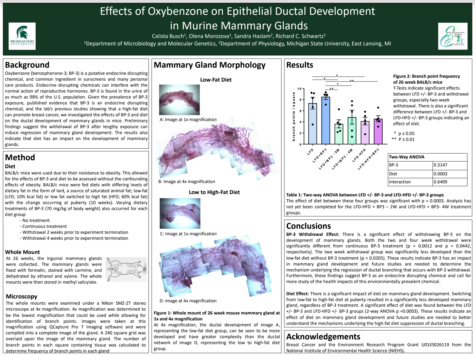 Given the prevalence of BP-3 exposure, published evidence that BP-3 is an endocrine disrupting chemical, and the lab’s previous studies showing that a high-fat diet can promote breast cancer, we investigated the effects of BP-3 and diet on the ductal development of mammary glands in mice. To that end, BALB/c mice were fed diets with or without BP-3. The diets also varied in dietary fat. Mice were fed a continuous low-fat diet (LFD; 10% kcal fat), continuous high-fat diet (HFD; 60% kcal fat), high-fat diet switched to low-fat diet (HFD-LFD) after puberty, or low-fat diet switched to high-fat diet (LFD-HFD) after puberty (10 weeks of age). To determine if BP-3 had a continued impact after exposure ended, two additional diet groups included withdrawal of BP-3 for 2 weeks and 4 weeks before termination of the experiment. At 26 weeks of age, mammary glands were collected from the mice. Images of whole mounted mammary glands were captured using a Nikon stereo microscope at 4x magnification. The frequency of branch points in each mammary gland was calculated as a representation of glandular development, and the differences in branch point frequency between diet groups were statistically compared. Preliminary findings suggest the withdrawal of BP-3 after lengthy exposure can induce regression of mammary gland development. The results also indicate that diet has an impact on the development of mammary glands.