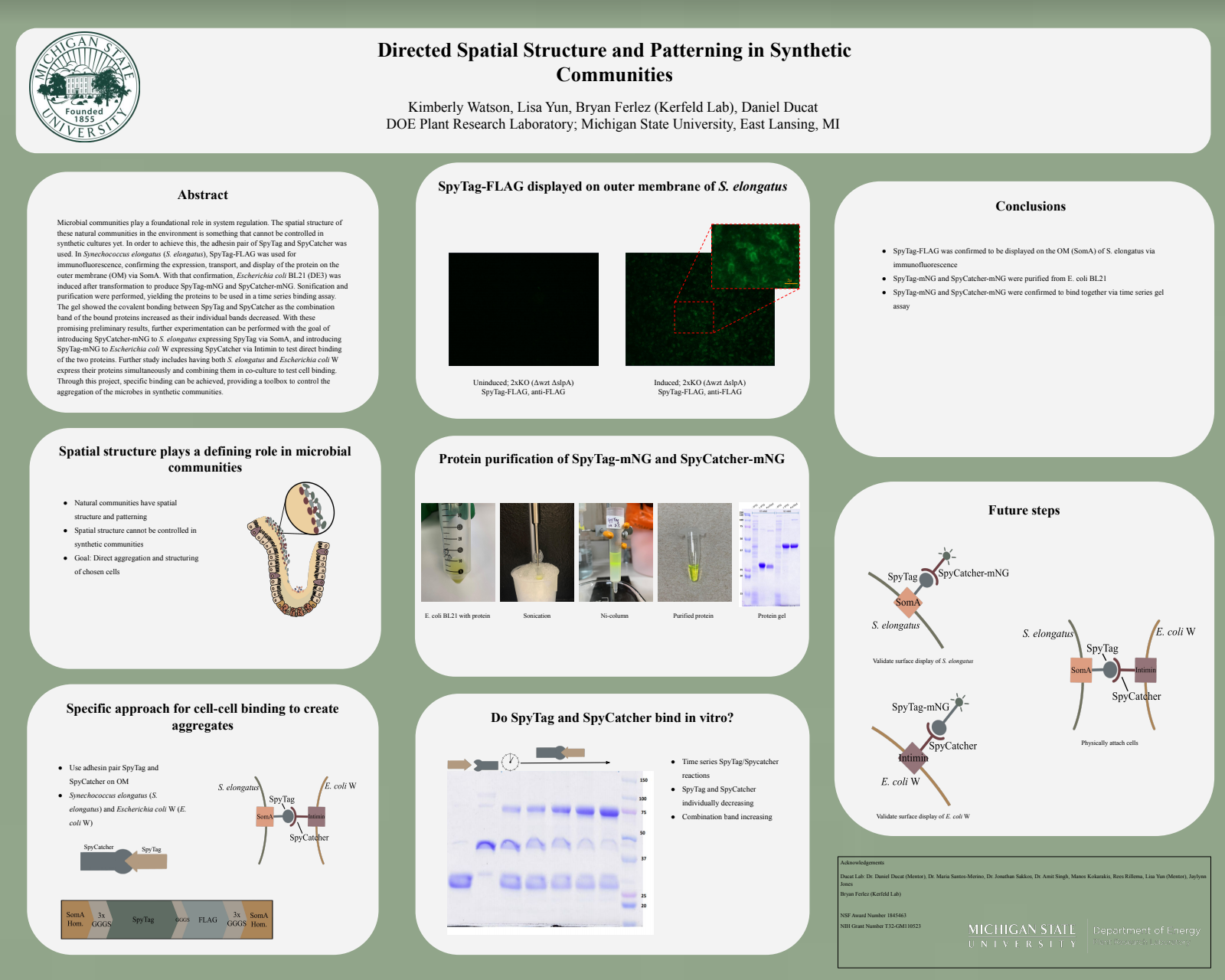 Microbial communities play a foundational role in system regulation. The spatial structure of these natural communities in the environment is something that cannot be controlled in synthetic cultures yet. In order to achieve this, the adhesin pair of SpyTag and SpyCatcher was used. In Synechococcus elongatus (S. elongatus), SpyTag-FLAG was used for immunofluorescence, confirming the expression, transport, and display of the protein on the outer membrane (OM) via SomA.