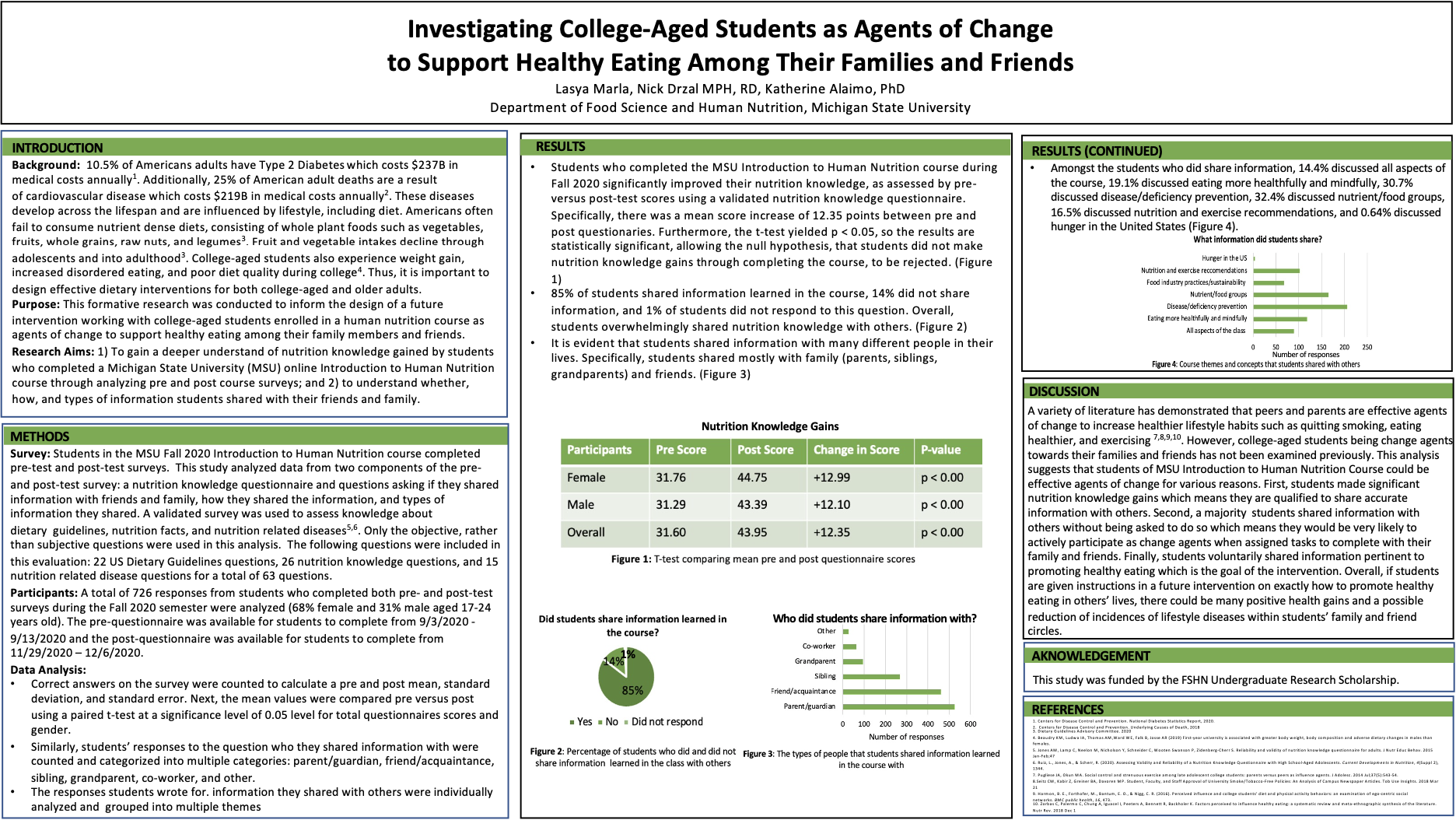 Research Aims: 1) To gain a deeper understand of nutrition knowledge gained by students who completed a Michigan State University (MSU) online Introduction to Human Nutrition course through analyzing pre and post course surveys; and 2) to understand whether, how, and types of information students shared with their friends and family.