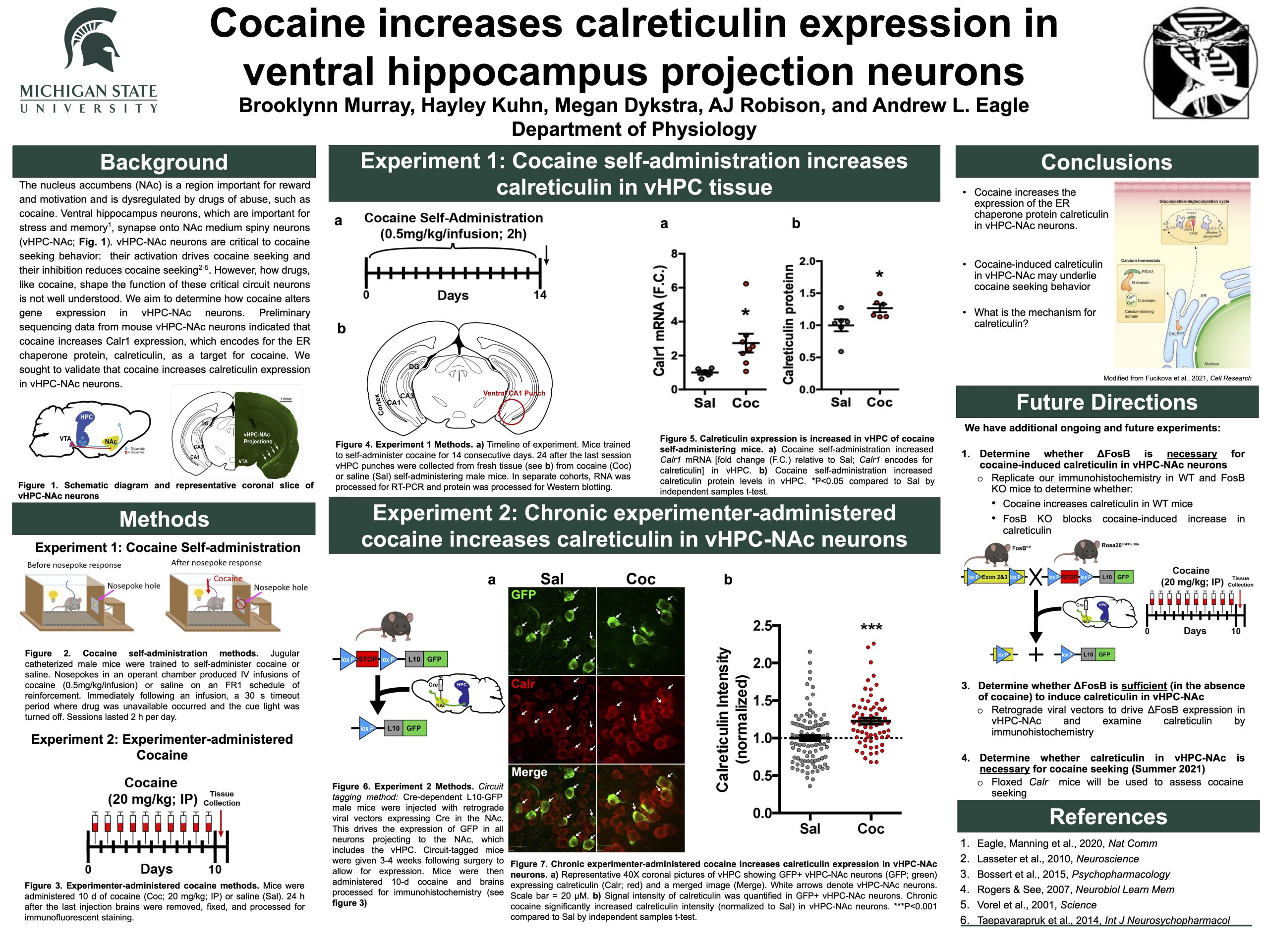 The nucleus accumbens (NAc) is a region important for reward and motivation and is dysregulated by drugs of abuse, such as cocaine. Ventral hippocampus neurons, which are important for stress and memory1, synapse onto NAc medium spiny neurons (vHPC-NAc; Fig. 1). vHPC-NAc neurons are critical to cocaine seeking behavior: their activation drives cocaine seeking and their inhibition reduces cocaine seeking2-5. However, how drugs, like cocaine, shape the function of these critical circuit neurons is not well understood. We aim to determine how cocaine alters gene expression in vHPC-NAc neurons. Preliminary sequencing data from mouse vHPC-NAc neurons indicated that cocaine increases Calr1 expression, which encodes for the ER chaperone protein, calreticulin, as a target for cocaine. We sought to validate that cocaine increases calreticulin expression in vHPC-NAc neurons.