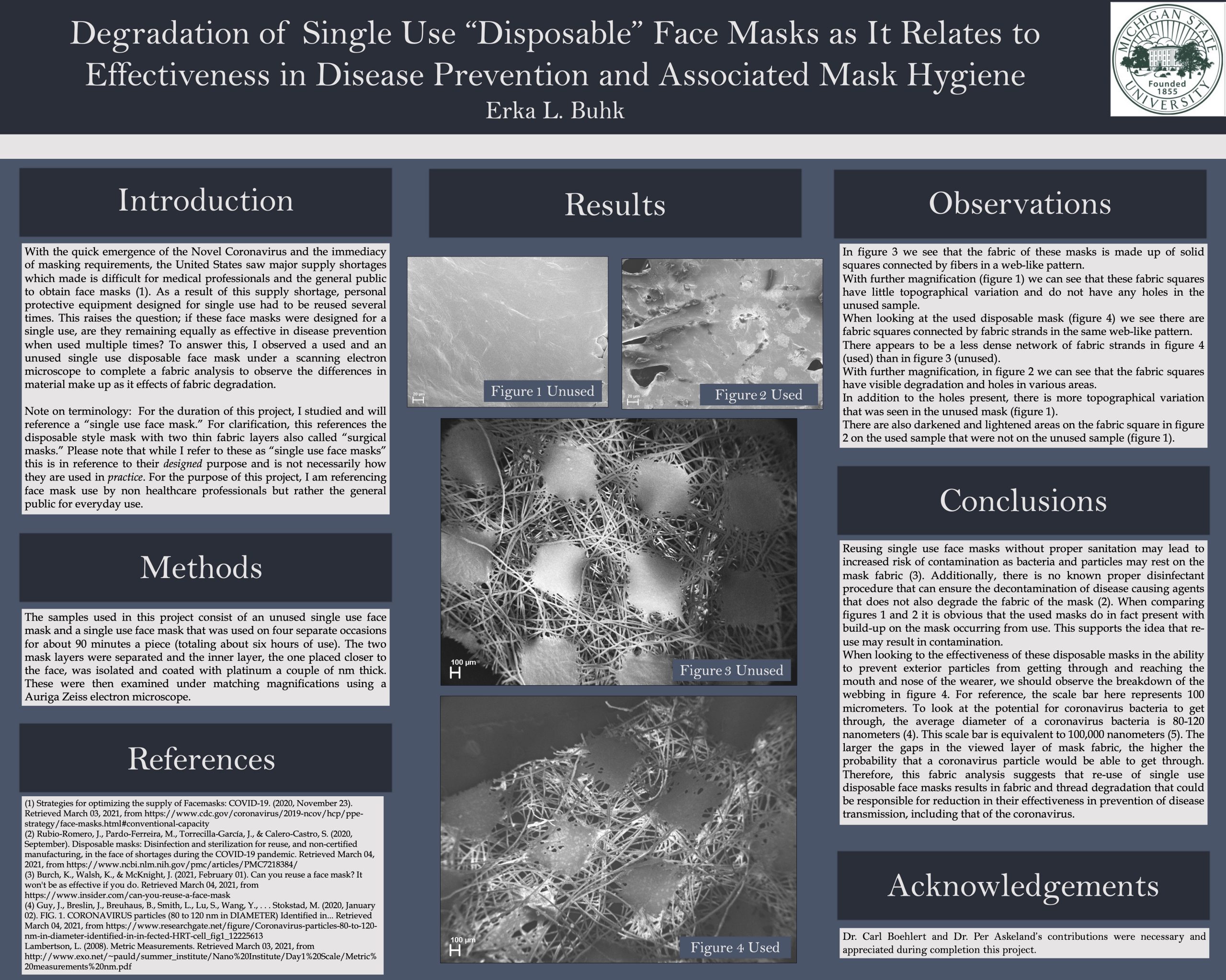 I conducted research on the degradation of disposable face masks. I utilized electron microscope technology to capture electron level images in contribution to a fabric analysis to compare the fiber degradation of single use ″disposable″ masks. This analysis includes distributions of fabric changes on the SEM images. I used these images paired with research on the functionality of face coverings to highlight the importance of proper mask usage and how common incorrect and re-use can result in adverse health effects.