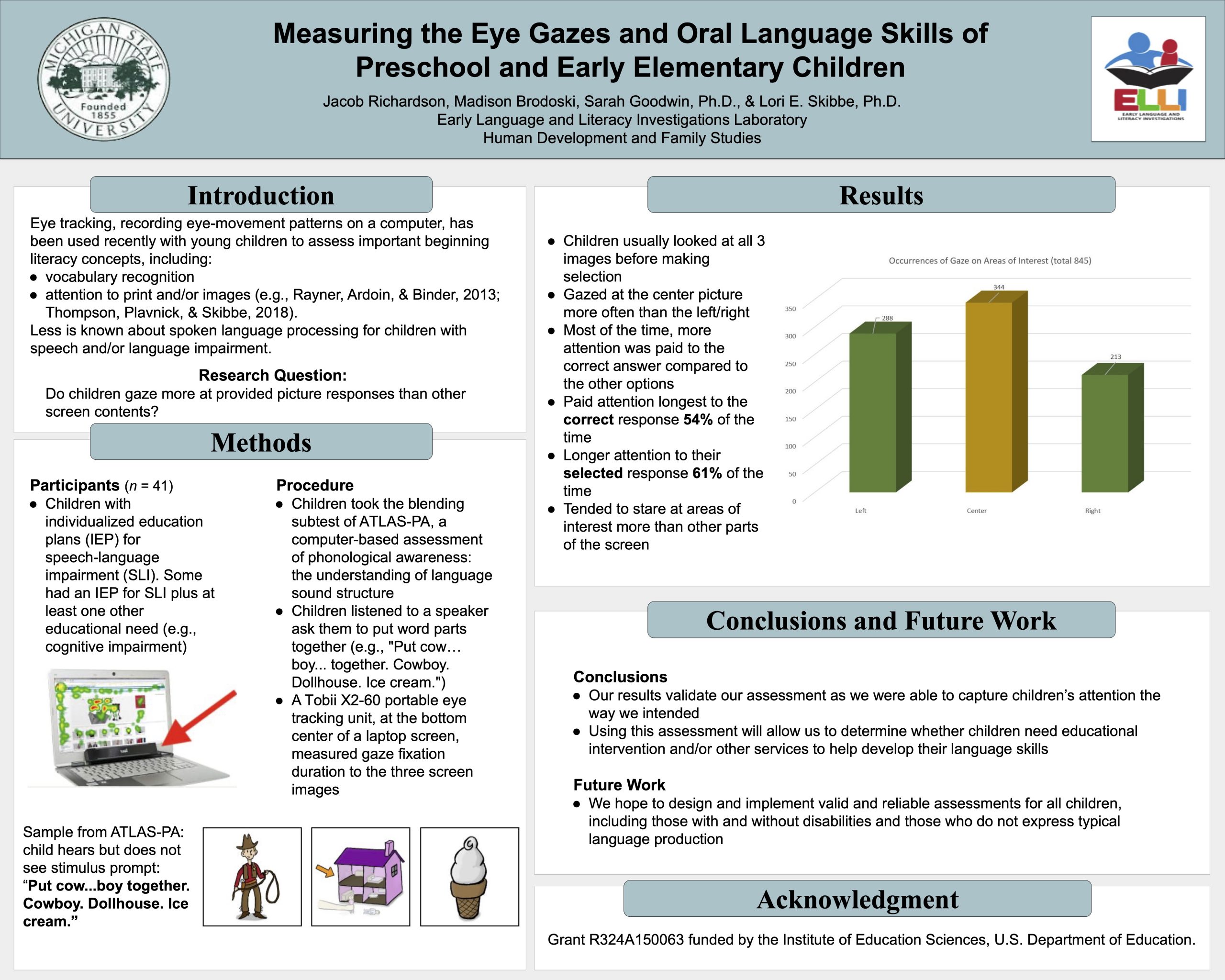 The present research uses eyetracking technology to examine how children with limited speech production attended to English phonological awareness (PA) items. Eye tracking, capturing eye-movement patterns with computer technology, has been used with young children, especially beginning readers (Rayner, 1986; Rayner, Ardoin, & Binder, 2013). With respect to early language and emergent literacy, eyetracking has revealed how children attend to recognizing receptive vocabulary items or picture book content (Thompson, Plavnick, & Skibbe, 2018). Determining whether children are focusing on core content impacts the design of early language assessments, especially for children who cannot verbally indicate their responses. Enhancing our understanding of children’s early language processing is critical to monitoring progress and determining appropriate interventions. Thus, this poster presents the eye gazes of preschoolers and early elementary children to investigate the attention they pay to computer-based test items designed to assess emergent literacy. Children (n=62; ages 3 to 8) with limited speech production (existing diagnoses including but not limited to autism spectrum disorder, attention-deficit/hyperactivity disorder, and/or hearing difficulty) took a computer-based assessment of English phonological awareness (PA). PA, or the underlying sensitivity to the sound structure of language, is an important component of learning to read (McDowell, Lonigan, & Goldstein, 2007) and predicts later reading even after controlling for other early literacy abilities such as letter name knowledge (NELP, 2008). Recruitment occurred at 57 sites, including Head Start and Great Start Readiness programs and elementary schools. Participants represented diverse educational and socioeconomic backgrounds. PA items were presented on a plain white background one-by-one on a laptop computer, with tasks of rhyming, blending (e.g., “Put cow… boy together”), and segmentation (e.g., “What’s cowboy without boy?”). Stimulus words were all highly concrete and reviewed by experts with experience in special education and early language. Children hear the audio stimulus while being shown three images, where they or an assessor can mouse-click or tap on their chosen response. A Tobii X2-60 portable eye tracking unit was used to assess gaze fixation duration to the three pictures presented on each screen. The eyetracker data revealed that children with speech and/or language impairment tended to pay attention longest to the correct response. Moreover, children gazed at the answer options from left to right, similar to how typically-developing children behave (Skibbe, Thompson, & Plavnick, 2018). Children with speech-language needs looked at all three options on the screen, indicating that all distractors were functioning as intended. Although calibration of the eyetracker was difficult for children who were lower functioning on the autism spectrum or who had behaviors that severely limited testing, results suggest that we are able to use this PA assessment with most children who are not able to answer the expressive items often used in other PA tests. These findings indicate that young children, even those who do not use spoken language in typical ways, are in fact using the newly-designed PA assessment in the way we anticipated. Recommendations for future research and implications for practitioners will be provided.