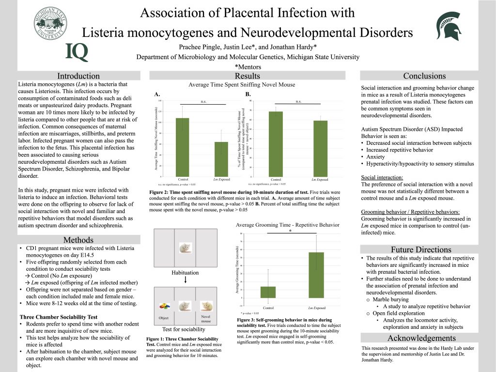 In this study, pregnant CD-1 mice were infected with listeria to induce an infection response on gestational day 14.5. Behavioral tests were done on the offspring to observe for lack of social interaction with novel and familiar and repetitive behaviors that model disorders such as autism spectrum disorder and schizophrenia.