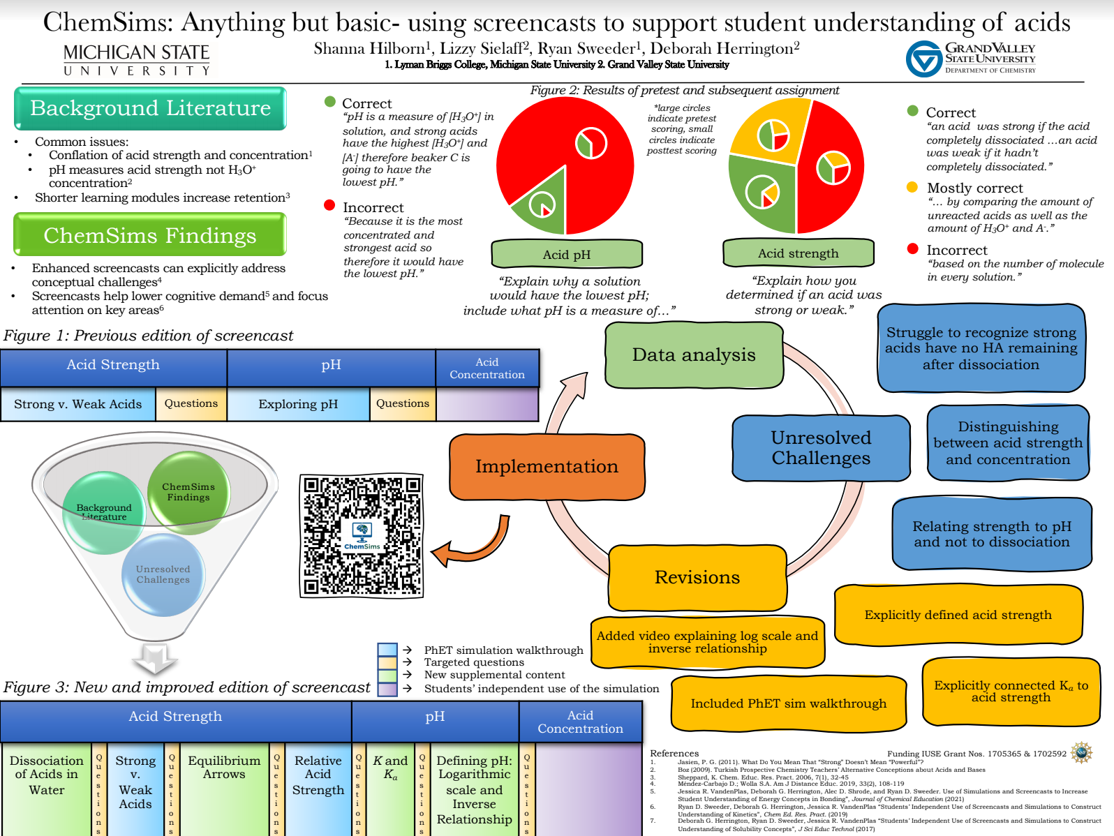 Though literature shows that particulate-level simulations benefit students’ conceptual understanding of the submicroscopic world, there is little research regarding how to best support students’ independent use of these simulations outside of the traditional classroom environment. The ChemSims project aims to develop and evaluate materials to help students effectively use simulations for learning core chemistry concepts. As part of this larger project, we developed an introduction to acid solutions that students completed individually outside of class, engaging either with guided use of a PhET simulation or a screencast of an instructor using that same simulation. Analysis of our initial pre and post-assessments revealed students struggled with defining an acid as well as differentiating between acid concentration and acid strength. Our iterative design approach allowed for us to reimagine and revise our original screencast into two mini screencasts, and a self-exploration of acid concentration. The first screencast targets relative acid strength, the second focuses on determining pH through its inverse relationship with hydronium ions, and then in the last part students engage with the simulation to explore concentration. This poster will present the results of our initial pre-post analysis and how this along with prior findings from the ChemSims project informed the materials redesign.